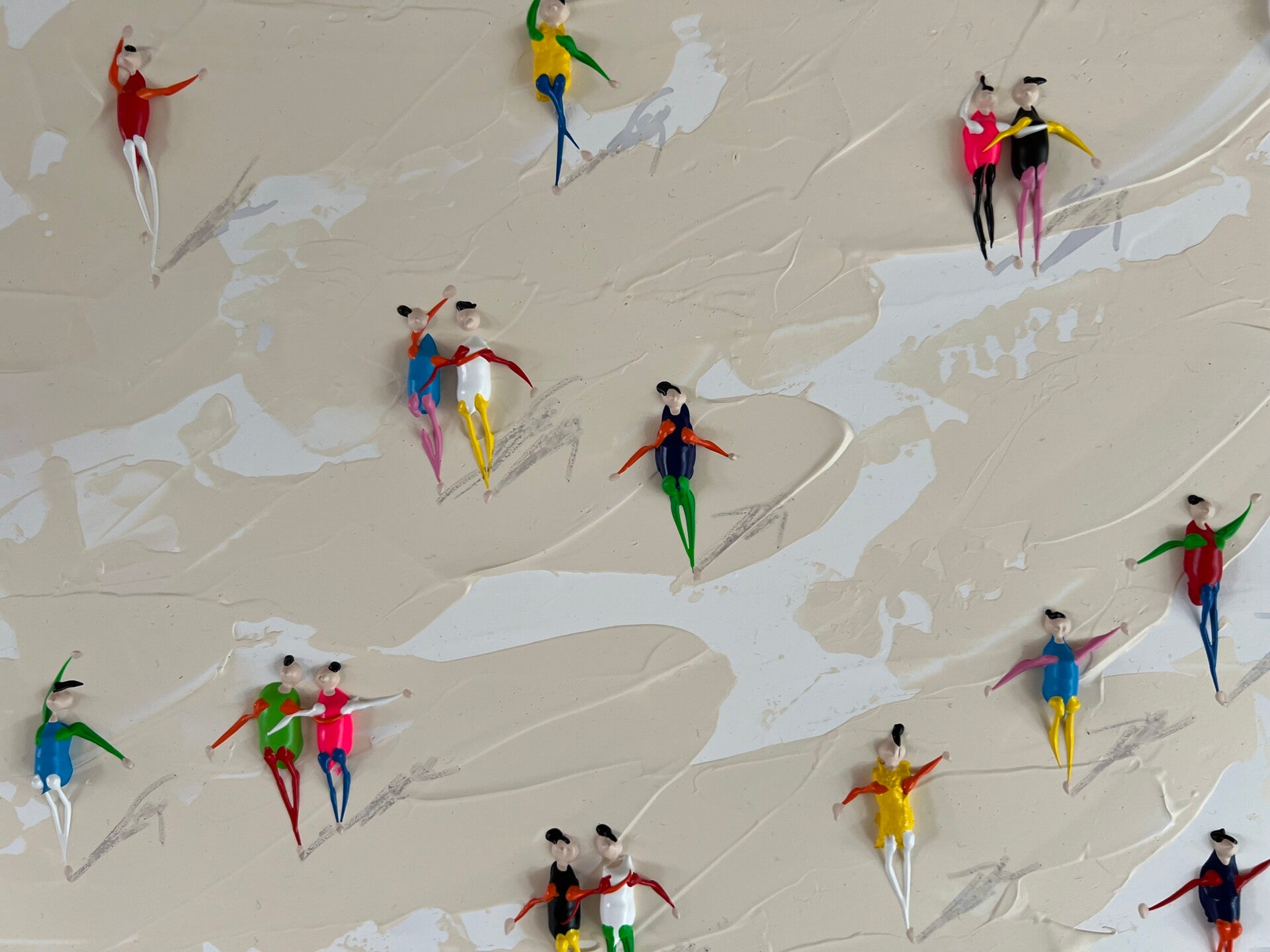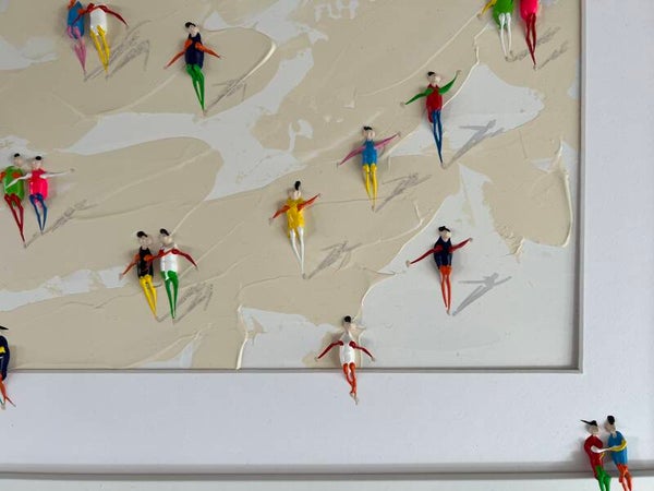In my work, acrylic paints flow together to form a mesh of surrealism, figurative elements and geometric clarity. The composition is an ode to freedom and the dynamism of life. Every line, every splash of color is carefully placed to create an atmosphere of weightlessness and connection that captures viewers in a web of emotion and reflection. This painting will exude an aura of thoughtfulness and creative energy in your space.