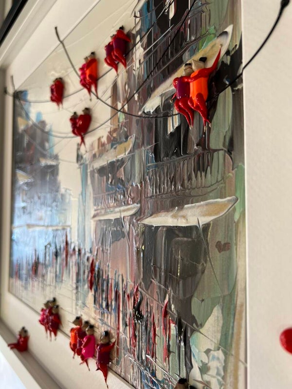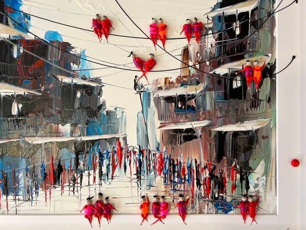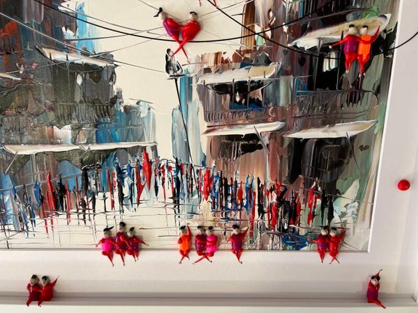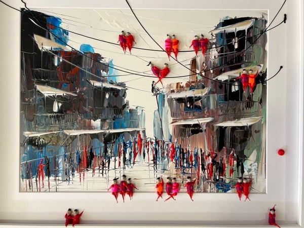 In my work, acrylic paints flow together to form a mesh of surrealism, figurative elements and geometric clarity. The composition is an ode to freedom and the dynamism of life. Every line, every splash of color is carefully placed to create an atmosphere of weightlessness and connection that captures viewers in a web of emotion and reflection. This painting will exude an aura of thoughtfulness and creative energy in your space.