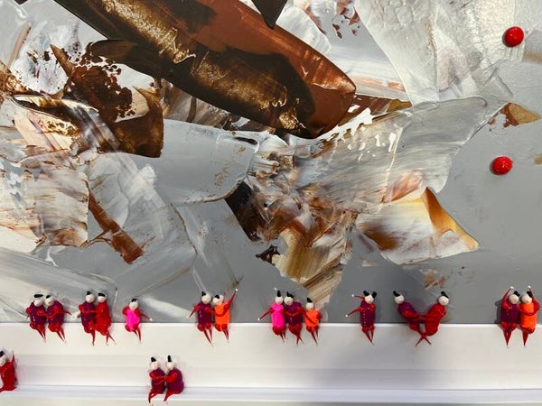 In my work, acrylic paints flow together to form a mesh of surrealism, figurative elements and geometric clarity. The composition is an ode to freedom and the dynamism of life. Every line, every splash of color is carefully placed to create an atmosphere of weightlessness and connection that captures viewers in a web of emotion and reflection. This painting will exude an aura of thoughtfulness and creative energy in your space.