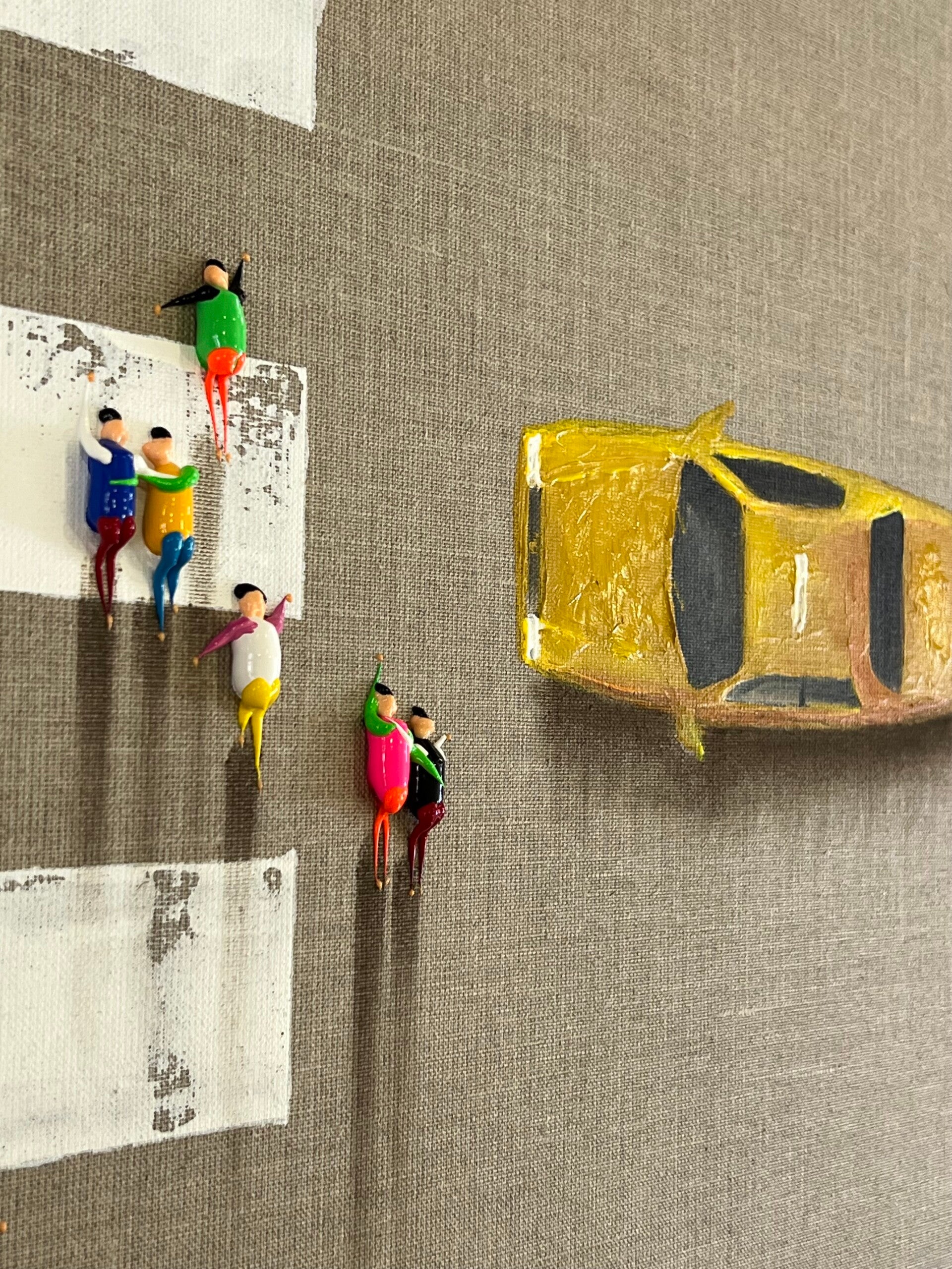 The yellow car reflects the city’s unceasing pace, while the vibrant figures represent energy, individuality, and the diversity that unites within a shared movement.